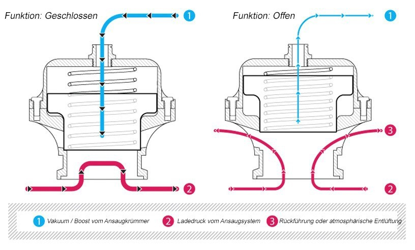 Los Blow Off Ventile solo están permitidos como sistema cerrado en la circulación en carretera. La variante abierta se utiliza principalmente en deportes de motor o en vehículos de exhibición.